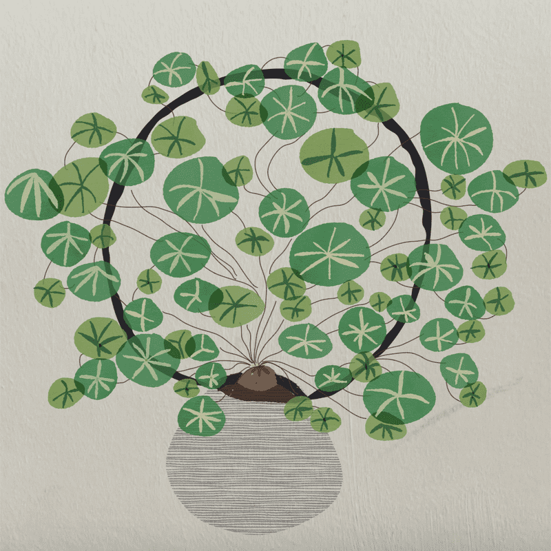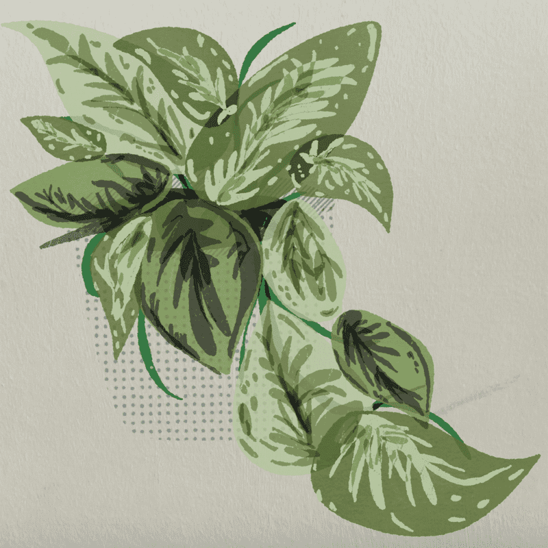 Heart shaped with splashes of silver and moss green, the satin pothos adapts to its environment through its size and vines. The patterns on its leaves are never constant.
