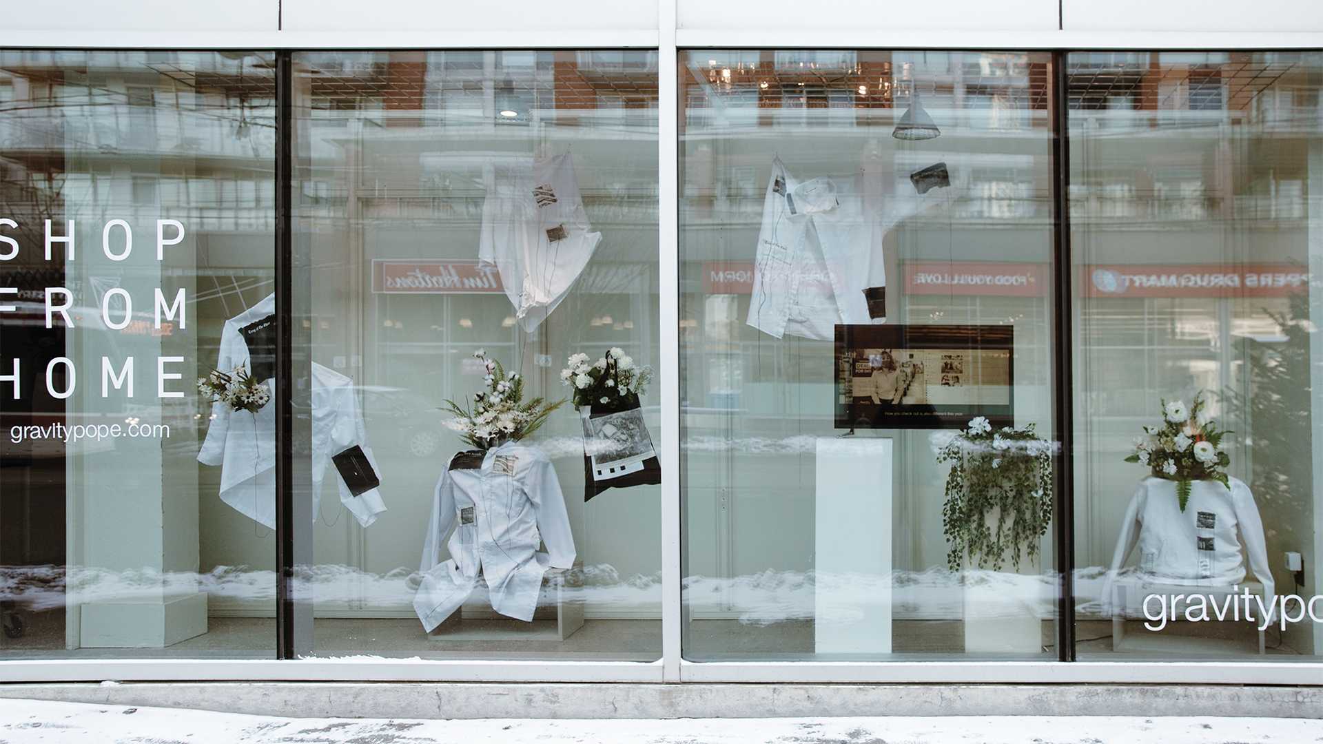 Vu’s installation, “song of the shirt,” was exhibited in the window of Gravity Pope at 1010 Queen Street West as part of the DesignTO festival. Featuring a series of upcycled white shirts sewn with patches of washed-out photographs and newspaper cut-outs, Vu’s monochromatic fashion piece questions the ethics concerning the exploitation of factory workers in the garment manufacturing industry. His work was inspired by “The Song of the Shirt,” a poem by Thomas Hood, and he wanted to share his knowledge about the fashion industry to a wider audience.